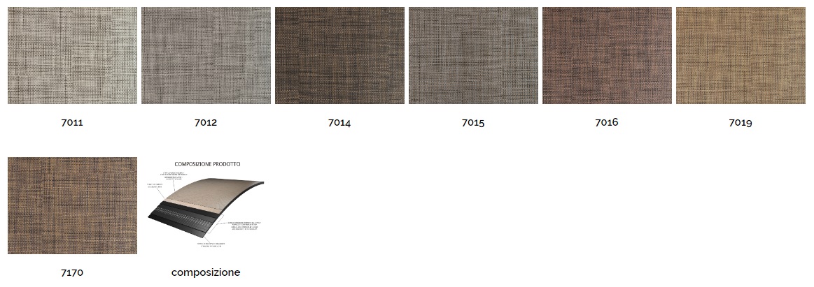 Costruzione. La superficie è estremamente resistente e permette una forte caratterizzazione e strutturazione. Inoltre la superficie in poliuretano risulta antibatterica e facile da pulire. Tra i 2 strati di PVC sottostanti la pellicola decorativa, viene inserito uno strato di fibra di vetro che conferisce stabilità dimensionale al prodotto. Il PVC utilizzato negli strati inferiori è PVC di prima sintesi, materia prima pura e certificata all’origine dal controllo di filiera.
