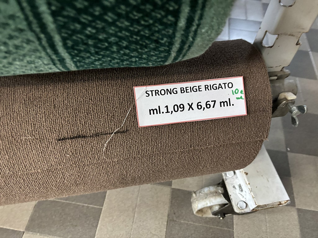 Moquette e Parquet - Bobina di passatoia tipologia Strong Beige Rigato etichetta con dimensioni: ml. 1,09 X 6,67 ml. di colore beige intenso con motivo a righe