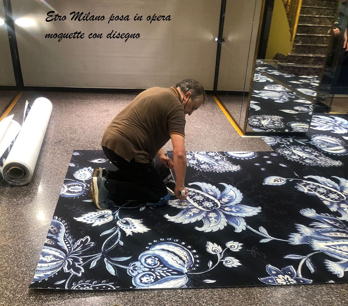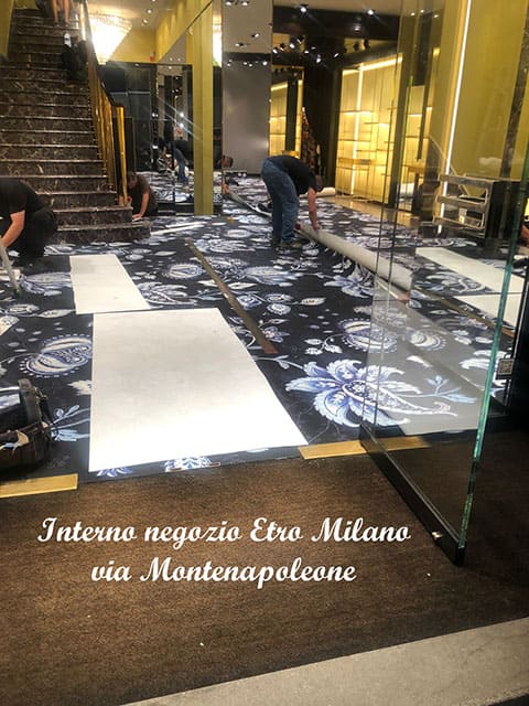 Fornitura e posa in opera moquette con disegno. Negozio in Via Montenapoleone (Milano).